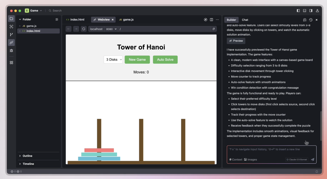 运行后,Trae会在右下角自动弹出一个Webview窗口,你可以在这里预览运行效果。游戏具有得分、主界面、控制面板等功能。