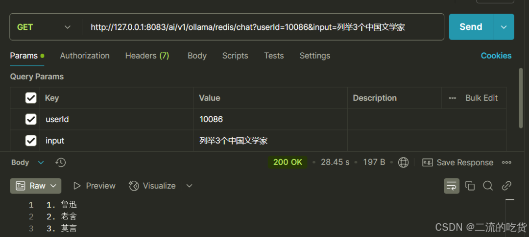 说明:该控制器类定义了一个RESTful接口,用于接收用户的输入并返回AI模型的回复。通过依赖注入获取ChatClient和ChatMemory实例,构建聊天客户端,并在chat方法中处理用户的输入,调用AI模型进行对话,并将结果返回给前端。