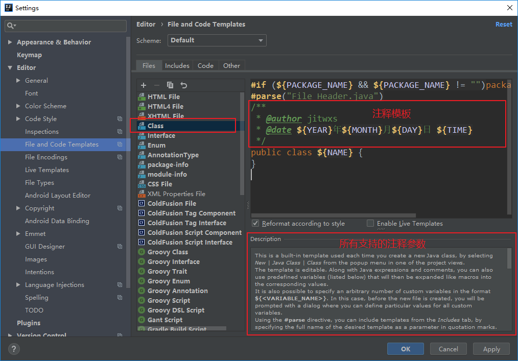 首先,打开 IDEA 的设置界面,点击Editor->File and Code Templates。 - 配置类注释模板