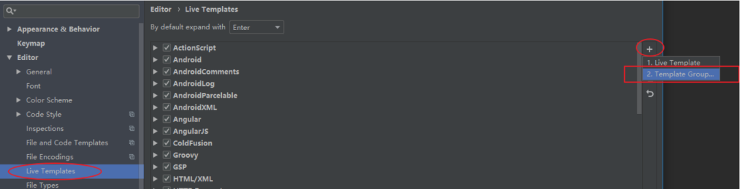在 IDEA 设置中,点击Editor->Live Templates。 - 创建模板分组