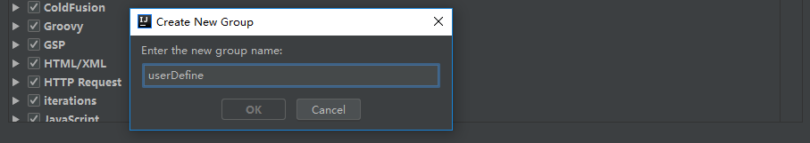 点击右上角的+,选择Template Group,创建一个分组,例如命名为userDefine。 - 添加 Live Template
